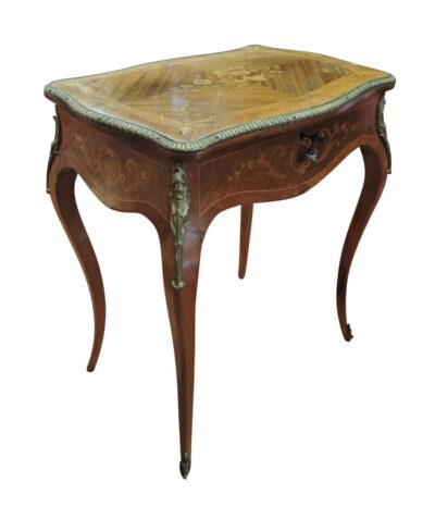 Small French Inlaid Satinwood Vanity Table, Gilt Bronze Trim and Edging