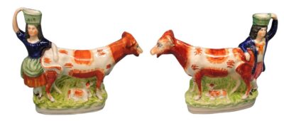 A Pair of Large Staffordshire Pottery “Cows and Figures” Milk Jugs, 19th Century