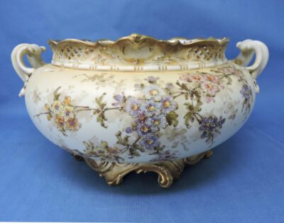 Large Turn-Teplitz Bohemia Austria Porcelain 2-Handled Jardiniere / Pot with Floral Blossoms and Gilt Decoration