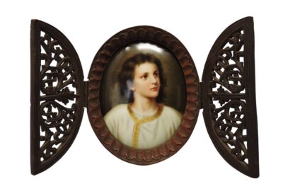 Small Porcelain Plaque of Young Jesus Christ, Housed in a Carved 3 Part Oval Wooden Frame, Easel Backing