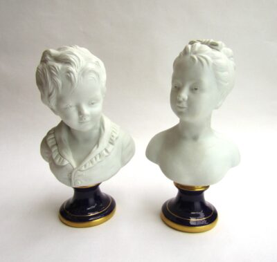 Pair of French Bisque Porcelain (After Houdon) Busts of Young Boy and Young Girl on Cobalt Blue and Gold Bases, Early 20th Century