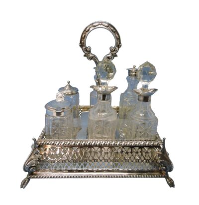 Silver-Plate and Patterned Crystal 6 Piece Cruet Set in Silver-Plate Holder with Claw Feet