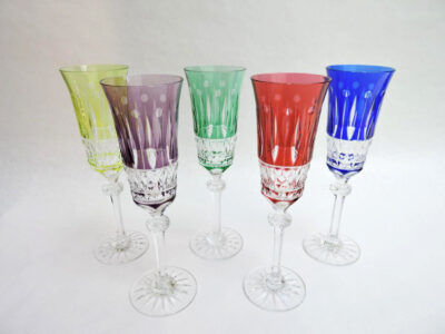 Set of 5 Coloured & Clear Patterned Crystal Champagne Flutes, “Cristallerie Lorraine” maker.