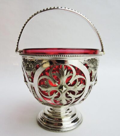 English Reticulated and Decorated Silver-Plate Basket with Movable Handle and Red Glass Liner, c. 1890