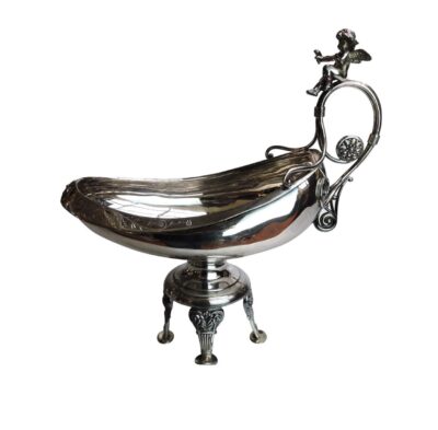 Silver-Plated Shell Shaped Dish with Cherub Holding Etched Crystal Posy Holder – Roger Smith & Co., c. 1860