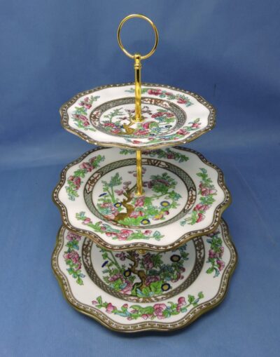 Coalport England Bone China 3-Tier Graduated Size Cake / Pastry Stand with Gold Tone Metal Holder – “Indian Tree” Pattern