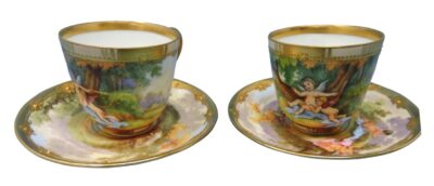 Pair of Richard Klemm Dresden Germany Demi-Tasse Hand-Painted Cups and Saucers, Putti Playing Outdoors