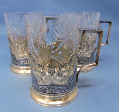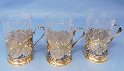 Set of 3 Etched Crystal Tea Glasses with Post-Revolution (c. 1930) Russian Silver – Niello & Gold Wash Holders