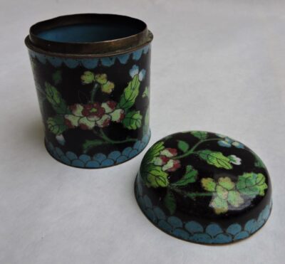 Chinese Cloisonne Enamel Cylindrical Box with Black Background, Colourful Flowers & Leaves.