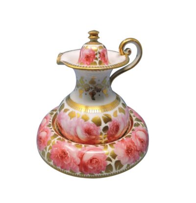Early, Miniature Davenport English Painted Bone China Lidded Jug with Under-Bowl, “Dav 18” Pattern, circa 1815-30