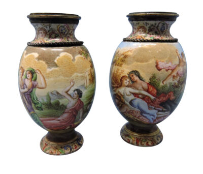 Pair of Miniature Viennese Enamel Painted Vases with Classical Figures/ Cherub Decorations