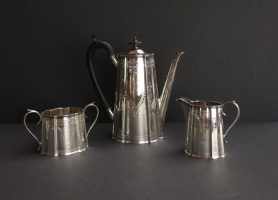 3 Piece Engraved Sterling Silver Coffee Set, London Hallmarked 1928 by Ellis & Co., Ebonized Handle and Finial