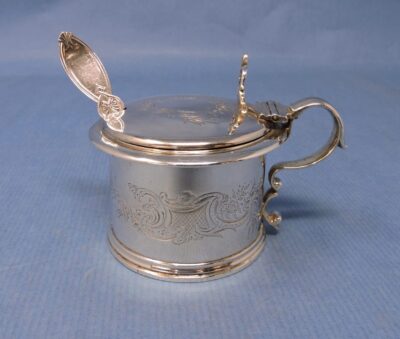 English Hallmarked (London 1837) Engraved Sterling Silver Mustard Pot by Chas.Fox, Cobalt Blue Glass Liner
