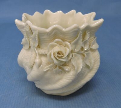 Belleek – Black Mark – Irish Porcelain Small Dish with Applied Flowers and Leaves
