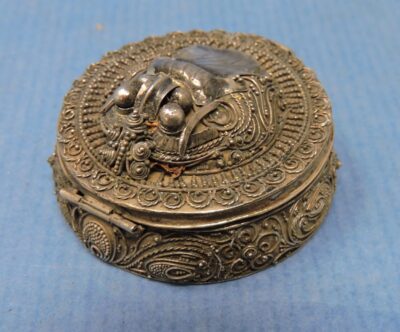 European Filigree Silver Small Round Box with Insect on Hinged Lid