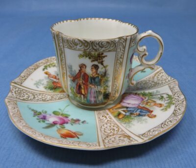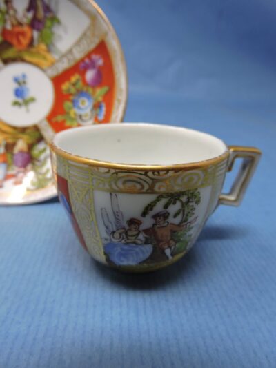 Meissen / Helena Wolfson ‘Augustus Rex’ Marked Porcelain Demi-Tasse Cup & Saucer – Painted with Panels of Flowers & Figures