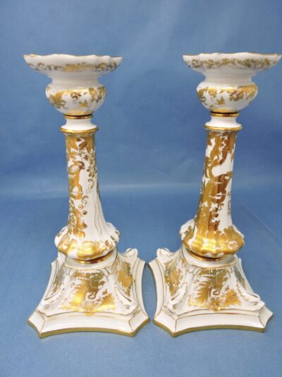 Pair of Tall Royal Crown Derby English Bone China White and Gold Candleholders – “Gold Aves” Pattern