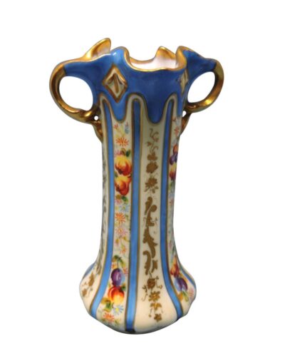 Royal Rudostadt German Porcelain Two Handled Small Vase with Painted Gilt, Flowers and Fruit Decorations