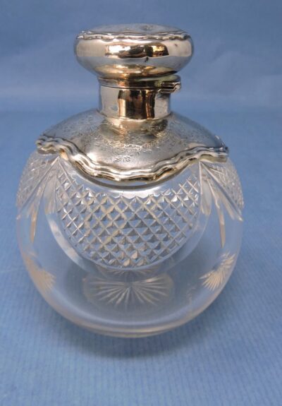 Cut Clear Crystal Perfume Bottle with Stopper & English Hallmarked (Birmingham 1910) Engraved Sterling Silver Rim & Hinged Lid