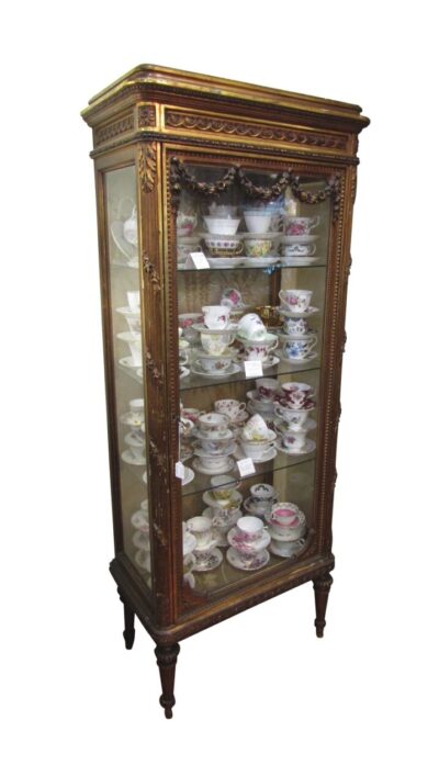 French Gilt Carved Wood Curio Cabinet with Bronze Floral Swag Mounts, c. 1890