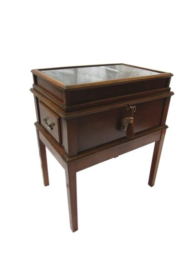 Edwardian Mahogany Shadowbox Showcase Table with Hinged, Bevelled Glass Top – dated 1902