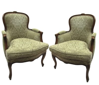 Pair of French Louis XIV Style Bergere Arm Chairs – Carved Walnut Frames