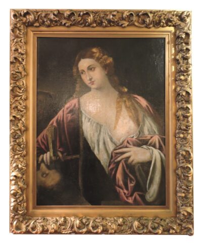 18th Century Oil Painting on Canvas “Judith with the Head of Holofernes” in Elaborate Heavy Gilt Gessoed Frame