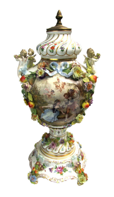 Huge – 24 inch – Early ‘Carl Thieme’ German Porcelain Hand-Painted Urn with Cherubs, Painted Figural Scenes, Applied Fruit & Flowers