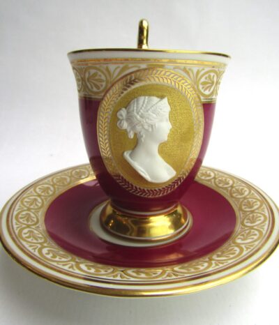 Late 19th Century Berlin KPM Porcelain Cameo Portrait Cup & Saucer, Burgundy & Gold