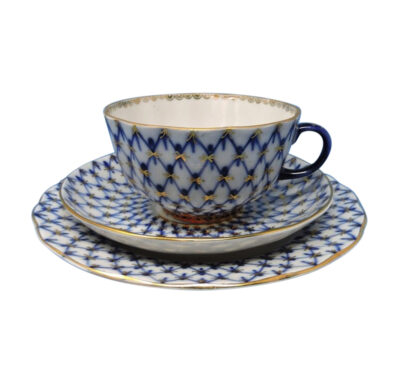 Russian – Lomonosov – Hand-Painted Porcelain Trio – Cup, Saucer and Underplate – “Cobalt Net” Pattern – USSR