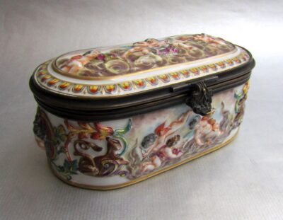Naples Porcelain Oval Hinged Box, 19th Century, Putti Playing Musical Instruments and Animal Decorations