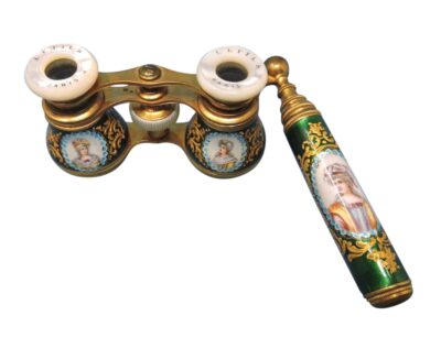 Le Fils Paris France Enamelled Porcelain, Brass, Mother of Pearl Opera Glasses, c. 1900, Telescopic Adjustable Handle