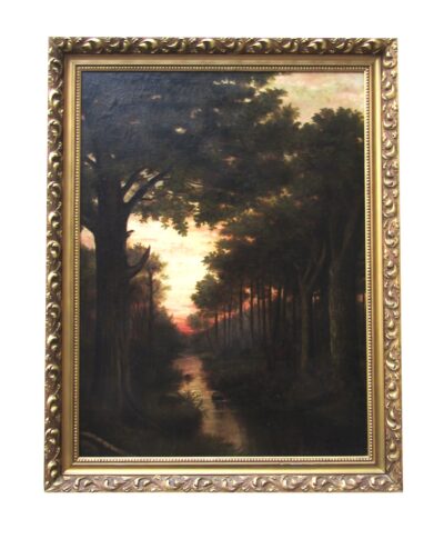 Large Oil on Canvas Painting – ‘Interior Forest Scene with Stream at Sunset’ – In Gilt Frame c. 1900 – 50 inches High.