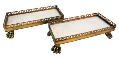 Pair of Gilt Bronze Rectangular Holders with Lion Paw Feet & Mottled White Marble Interior