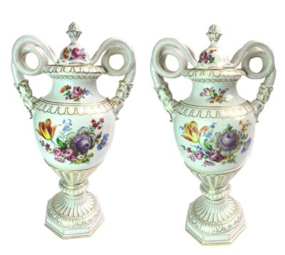 Pair of Large Carl Thieme Dresden Urns with Lids & Snake Handles – circa 1900 – 22 inches Tall.