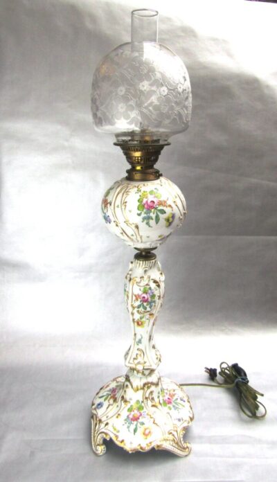 Tall French Porcelain Electrified Banquet Lamp with Hand-Painted Flowers & Gilding