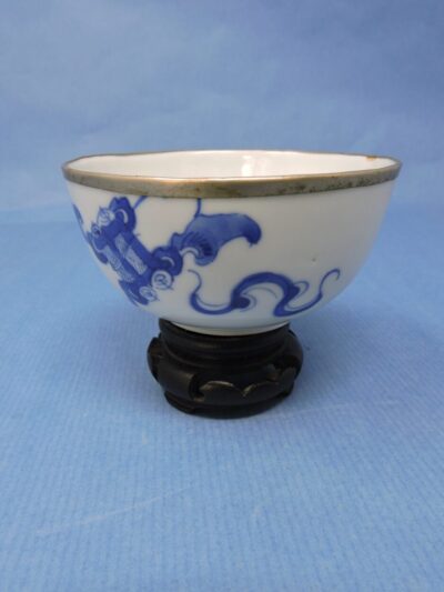 Chinese Blue and White Porcelain Small Round Bowl with Silver-Plated Rim, Signed on the Underside, Detachable Wooden Stand