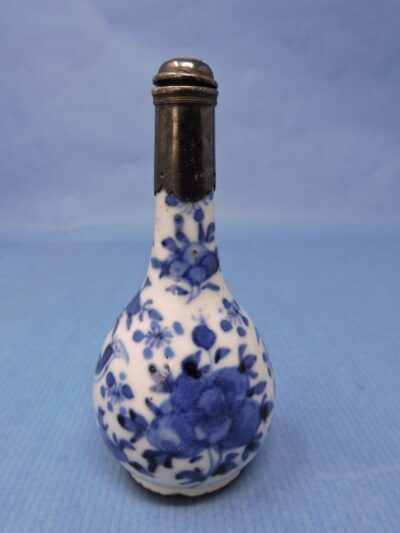 Chinese Blue and White Porcelain Small Flask with Silver-Plated Rim and Attached Lid, Floral and Bird Decorations