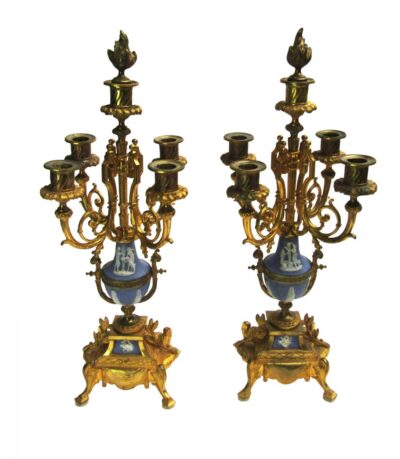 Pair of 5-Arm Gilt Bronze Candelabra with Jasper Blue Coloured Porcelain Grecian Figural Inserts