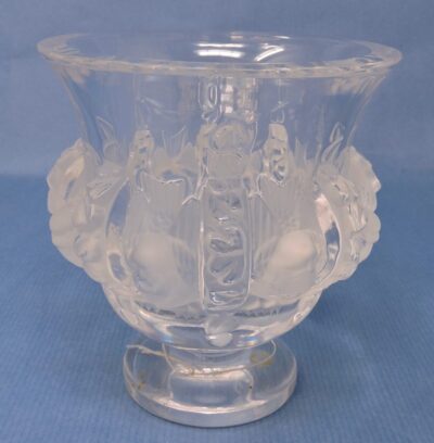 Signed Lalique France Clear Crystal Vase of Frosted Crystal Birds and Scroll Designs