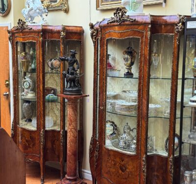 Pair of Impressive – Very Large, French Inlaid Wood & Ormolu, Curved Glass Cabinets – 81 inches tall x 48 inches wide.