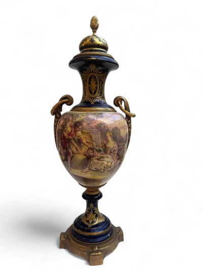Elegant & Stately Pair of 19th Century French Sèvres Royal Blue Porcelain & Bronze Covered Urns – Hand Painted Romantic Vignettes – Circa 1860