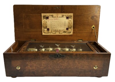 Large Swiss Cylinder Music Box with 7 Bells & Bird Strikers – Burled Walnut Case with Inlay – Plays 12 Songs