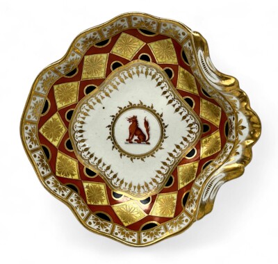 Regal & Rare Chamberlain Worcester Armorial Porcelain Dish, Centered Family Crest of a “Wolf” & Shell Shaped, Circa 1820