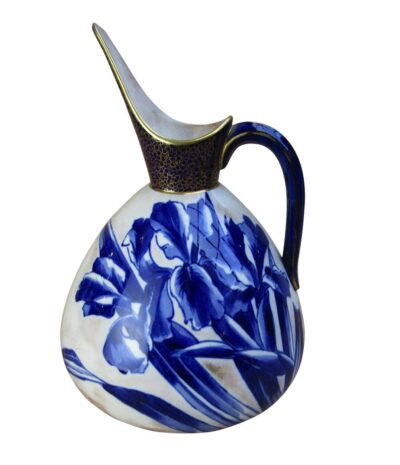 Doulton Burslem Flow Blue Porcelain Ewer with Hand-Painted Iris Flowers