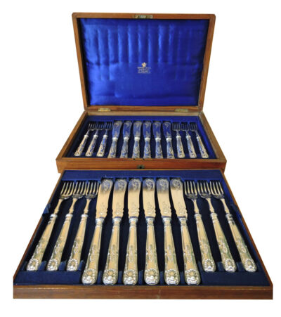 Mappin & Webb Elaborate Prince’s Silver-Plate Fish Service for 12 – “King’s Pattern” – Original Wooden Two-Tier Box