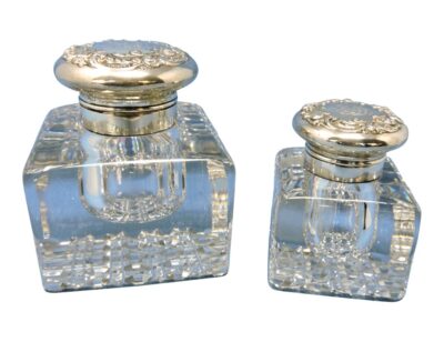 Pair of Gorham USA Sterling Silver and Heavy Crystal Square Inkwells, c. 1895