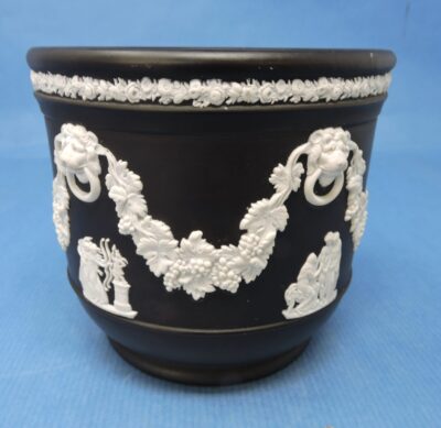 Wedgwood England Black Jasperware Small Planter with White Figural, Floral and Lion Decorations