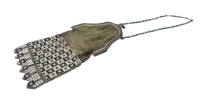 Silver Plated Mesh and Enamel Evening Handbag with Chain, Satin Interior, Made in Canada