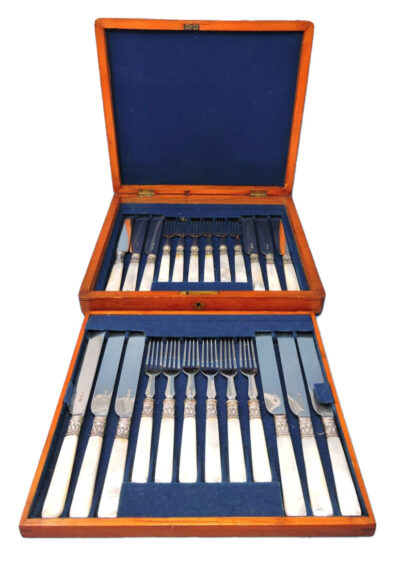 Mother of Pearl and Silver-Plated Dessert Set for 12 in Original Wooden Two-Tier Canteen